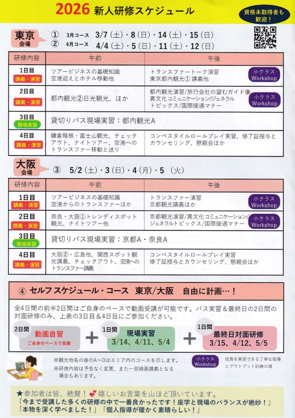 プログラム:ツアービジネス基本知識、人気観光地ガイドスキル、アウトプット演習・個別指導、
