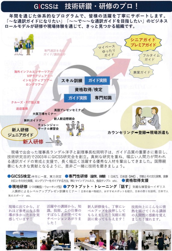 2003年GICSS研究会設立以来、毎年開催し続けてきた新人研修です。 すぐに現場で役に立つ知識と、お客様の満足をひきだすノウハウをベテラン講師が丁寧かつ熱意をもって“明るく楽しく元気よく”指導。通訳ガイドの現場デビューで失敗しない必要なスキルのほぼすべてをカバー。 デビュー前の方はもちろん、既に現場経験を積んでいる方にも、再確認、レベルアップ、自己分析等、プレミアガイドを目指すきっかけとなるでしょう。