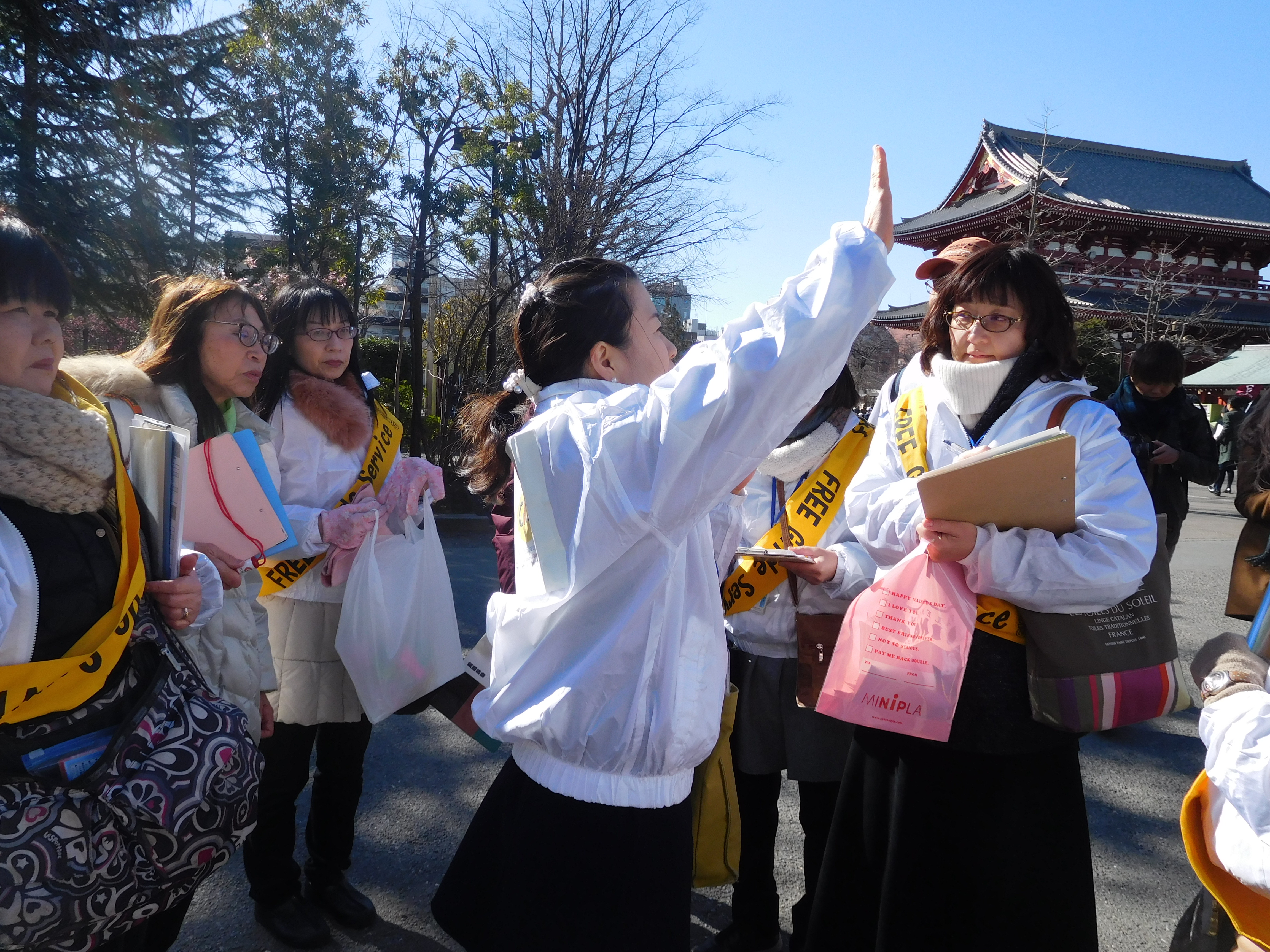 Guide Service GICSS」と書かれた黄色いタスキをかけ、プロの通訳案内士として多くのお客様に積極的にガイドサービスを提供することができました。